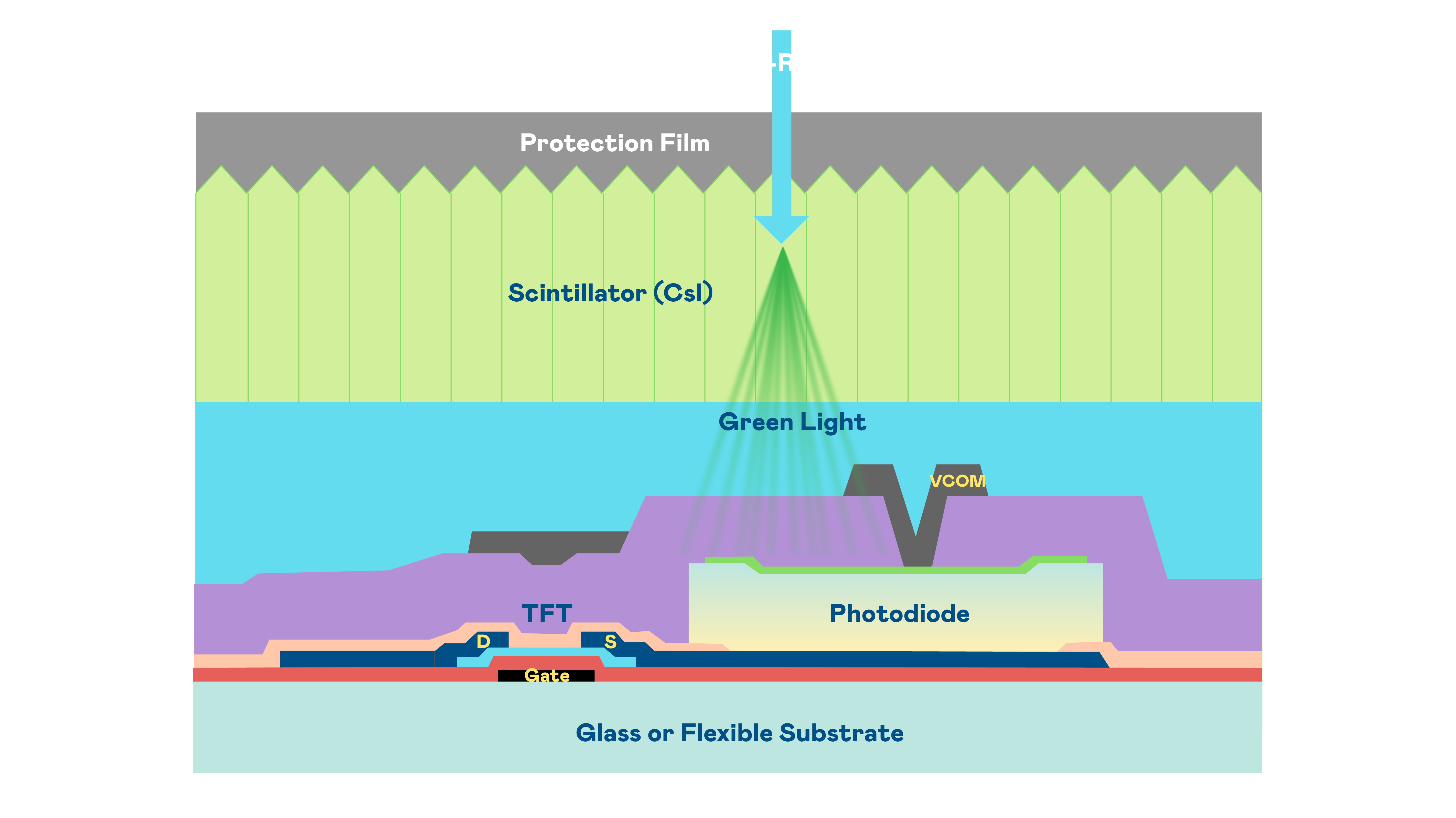 永利yl23411的X光影像感測陣列使用薄膜電晶體 (TFT) 作為每個像素的讀取開關,搭配光電二極體(Photodiode)的光電轉換元件,用以感測X光影像訊號。